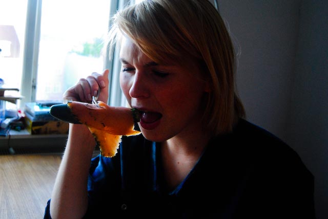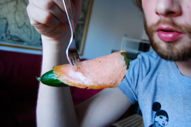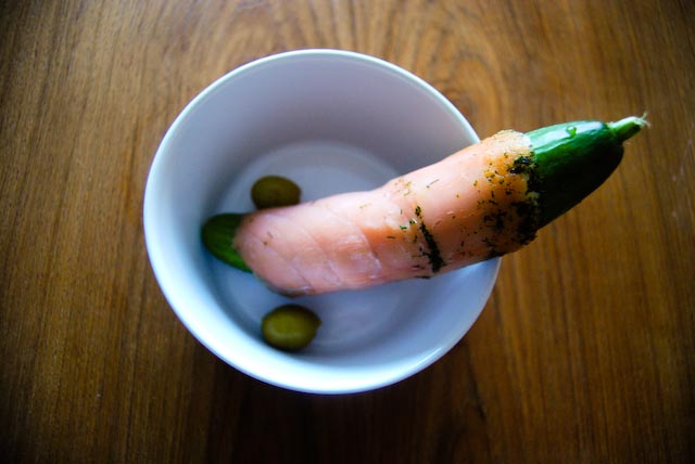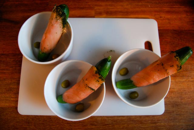 En skive gravad laks rulles helt tæt om en agurkerulle