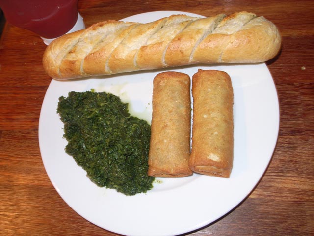 Daloon, hvidløgsbrød og spinat